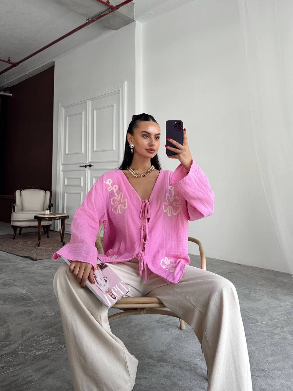 ✨ Luftiger Zweiteiler aus angenehm weichem Stoff in Pink und Beige. Die locker geschnittene Bluse mit feinen Stickdetails und Bindung vorne trifft auf eine weit geschnittene Hose – zusammen entsteht ein entspannter und stilvoller Look. Perfekt für warme Tage, Citytrips oder gemütliche Sommerabende – bequem, vielseitig und easy zu kombinieren.